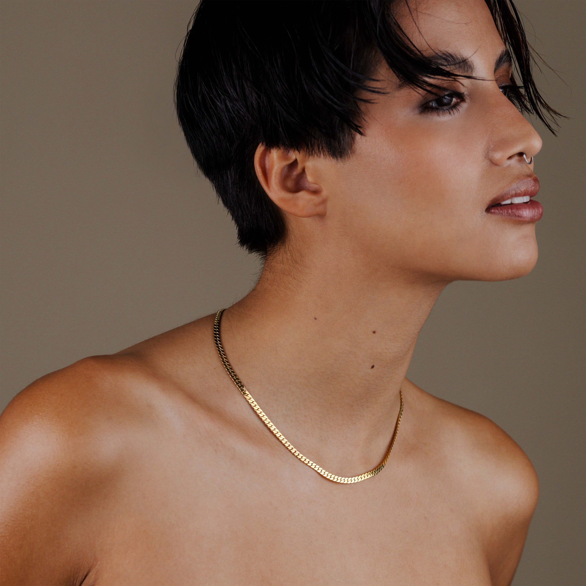 Unsere “Snaked” Necklace gehört definitiv zu den timeless Classics der Ketten und darf in keinem Schmuckkästchen fehlen. Wer gerne mehrere Ketten miteinander kombiniert oder auch einfach schlichte, basic Looks bevorzugt, hat mit diesem Piece seinen perfect Match gefunden. Die dezenten Kettenglieder liegen flach an und erinnern in ihrer Form an ein Schlangen- oder Fischgrätenmuster. Ideal für jeden Tag oder besondere Anlässe!