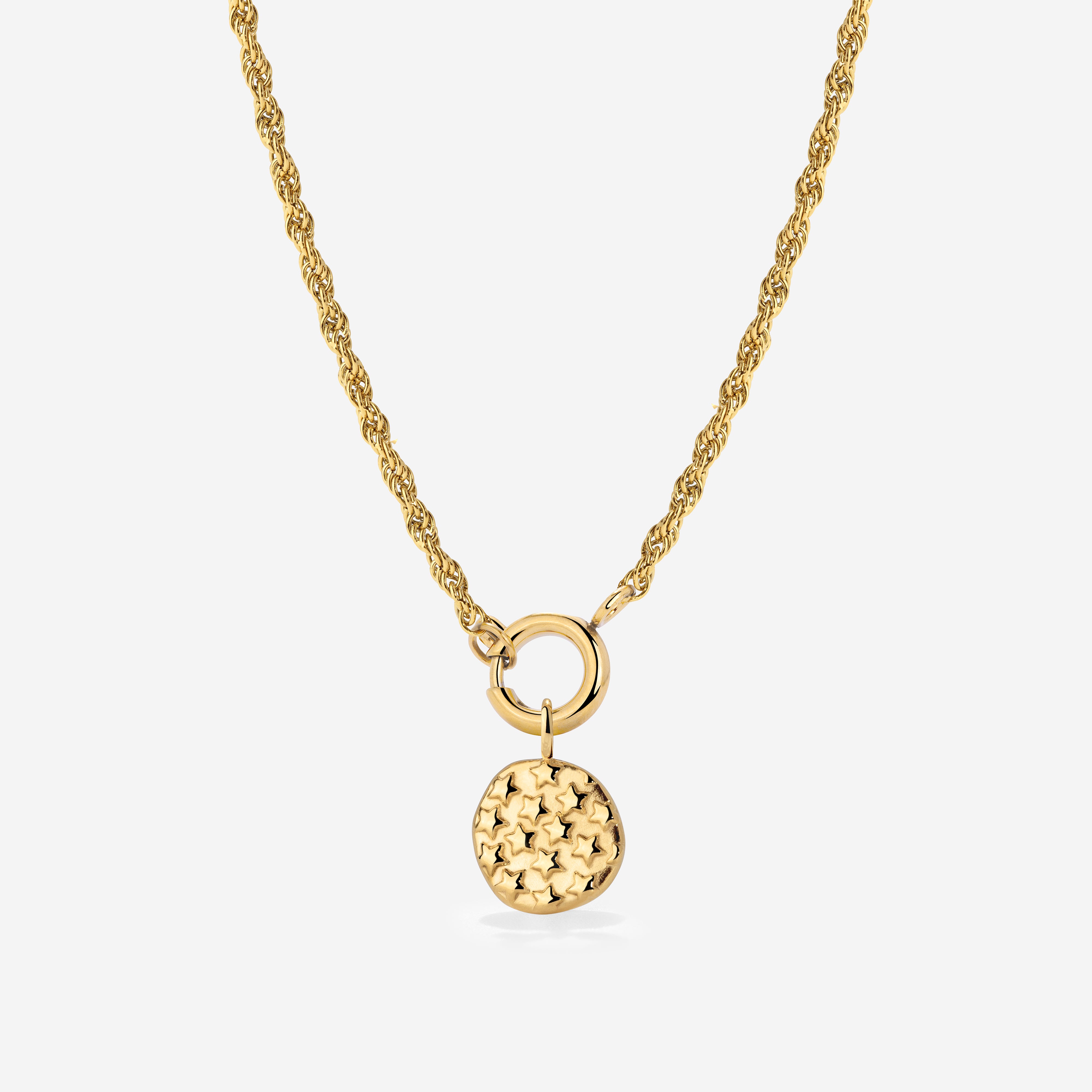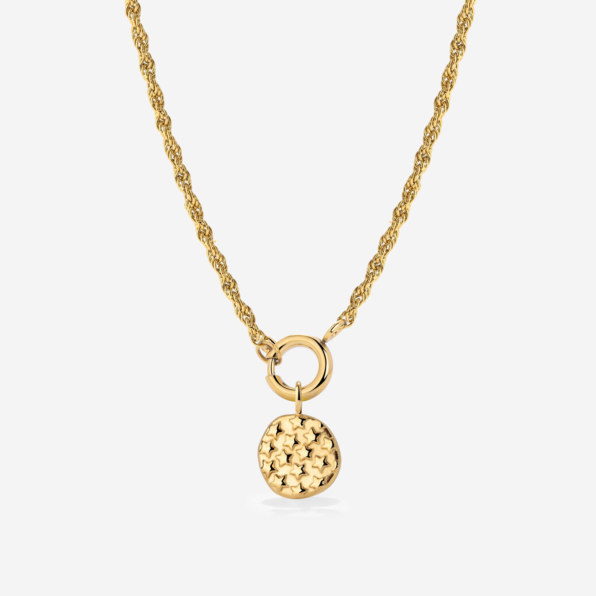 So wie ein Sternenhimmel an einer klaren Nacht strahlt auch unser “Starry Skies” Rope Chain Necklace Set an deinem Hals. Der Coin-Charm wird mit vielen kleinen Sternchen verziert und passt perfekt zur romantischen, gedrehten Rope Chain. In Kombination bekommst du ein Schmuckstück, welches sowohl im Alltag als auch zu besonderen Anlässen strahlt und funkelt und dich daran erinnert, dass das Universum und die Anzahl an Sternen und Planeten unendlich sind. Und wenn dir das noch nicht genug ist, hast du mit unserem passenden “Starry Skies” Oval Hoop Set Baby die perfekte Ergänzung zu deinem Look!