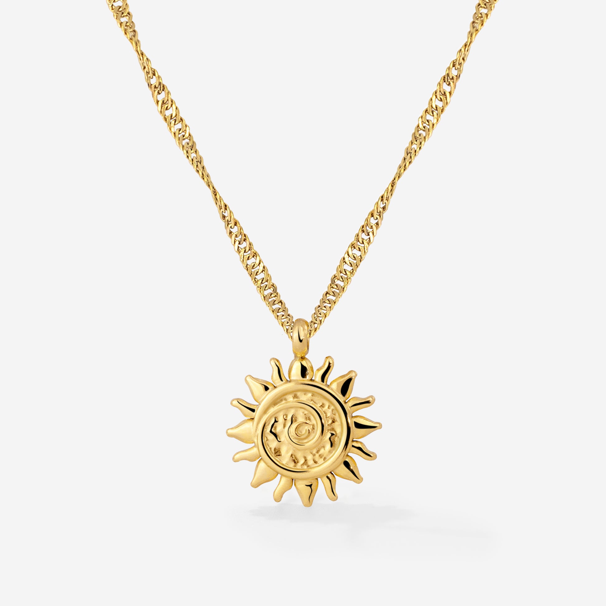 Unsere “Sunny Swirl Necklace” kombiniert das zeitlose Sonnenmotiv mit dem modernen Swirl-Motiv und ist eines der strahlenden It-Pieces unserer Kollektion. An der filigranen Singapore Chain wirkt der detailreiche Charm besonders edel und verfeinert jeden deiner Looks, ob allein oder im Layerlook. Get your favorite Sun-Lovers-Piece now!