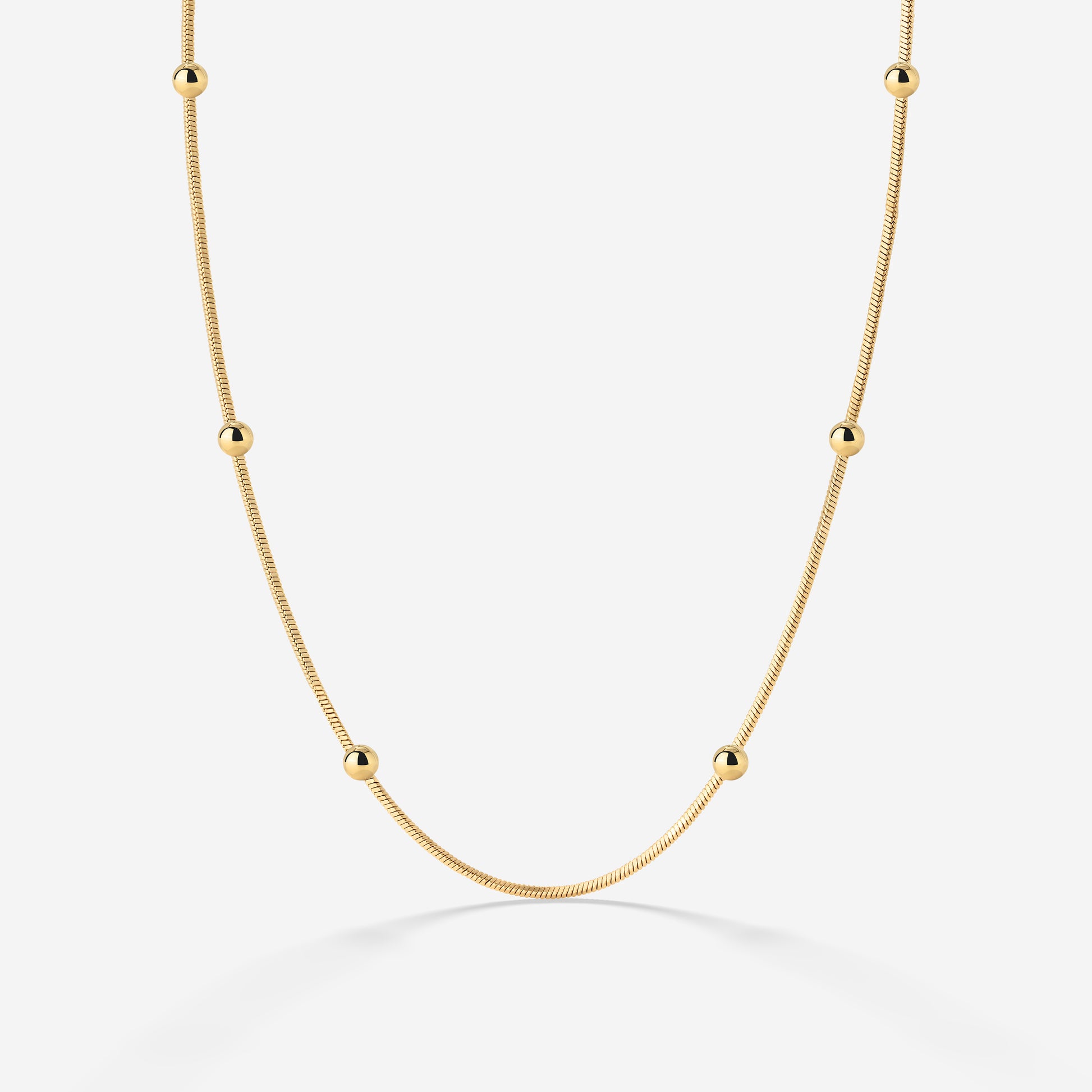 Minimalistische Halsketten sind all time favorites, weil sie zu jedem Stil, jedem Outfit, und jedem Anlass passen. Unsere “Moony” Necklace ist dabei keine Ausnahme und wird bestimmt schnell zu einem deiner Lieblingsschmuckstücke, welches zu am liebsten nie abnehmen würdest. Die schmale Snake Chain wird durch kleine Beads in regelmäßigen Abständen zu einem dezenten Eye Catcher, der dennoch nicht vom eigentlichen Look ablenkt. Durch ihr filigranes Design kannst du diese Kette perfekt als Basis zum layern benutzen oder sie auch allein tragen, wenn du zum “Weniger ist mehr”-Club gehörst!