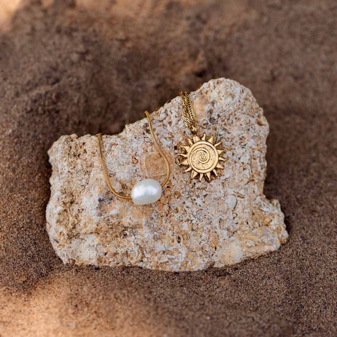 Was passt am besten zu einem strahlenden Sonnenanhänger? Klassische Süßwasserperlen natürlich! Mit unserem “Sunny Pearls” Bundle bekommst du beides gleich im Doppelpack und musst dir keine Gedanken darüber machen, wie du deinen Layer Look am besten stylst. Unsere “Sunny SwirlNecklace mit filigraner, gedrehter Singapore Chain und süßem, detaillierten Sonnenanhänger passt perfekt zur “Minimalist Pearl” Necklace, die den Look mit ihrer sleeken Round Snake Chain und wunderschönen, glänzenden Süßwasserperle unterstreicht. Probier es direkt aus!