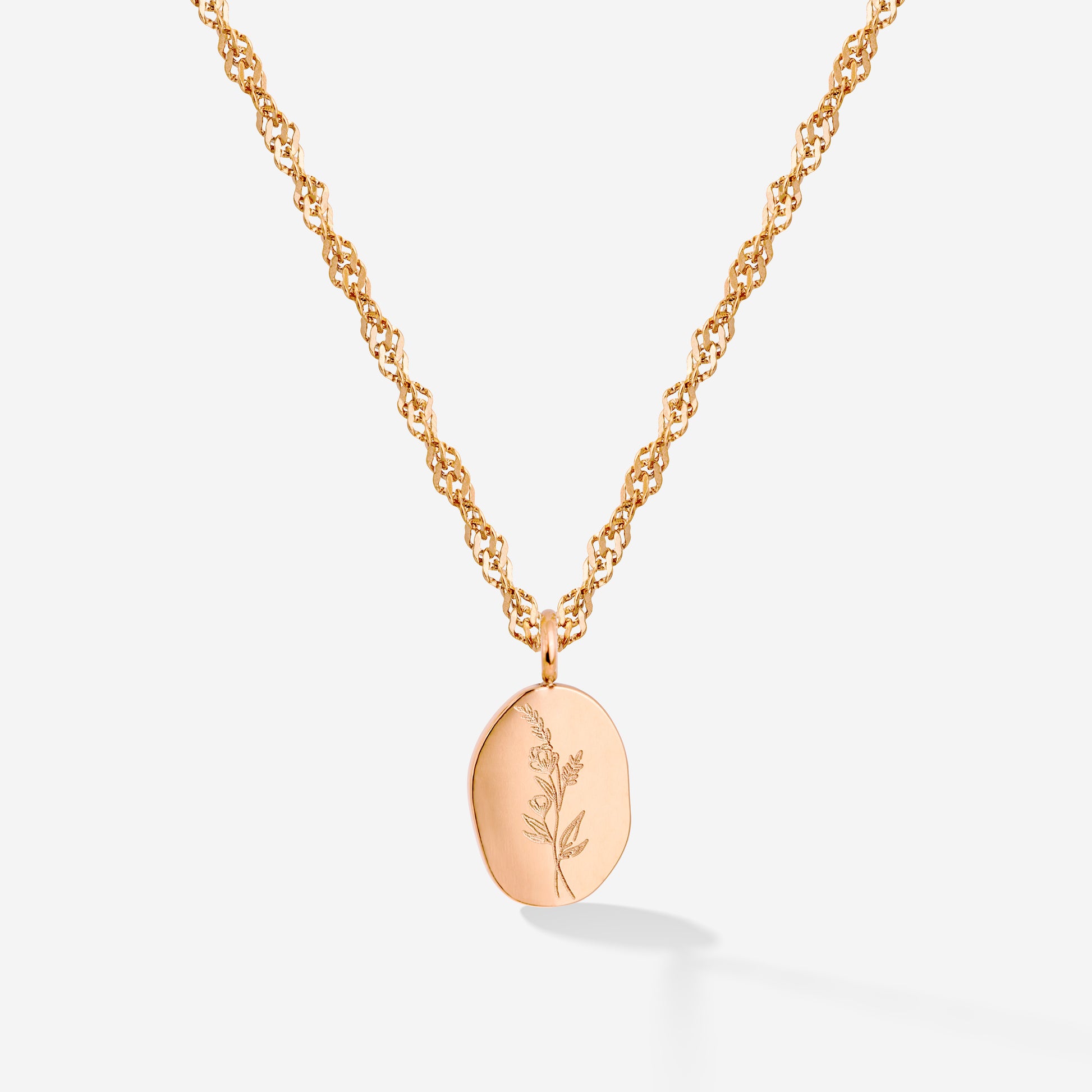 Was gibt es im Sommer Schöneres, als einen duftenden Strauß frische Blumen zu genießen, den man vielleicht sogar noch selbst gepflückt hat? Richtig - es zusammen mit unserer “Bouquet Coin” Necklace zu tun! Der ovale Anhänger, verziert mit feingravierten Wildblumen, schmückt jeden deiner Summer Looks mit einer ganz besonders frischen Note, und sieht sowohl allein als auch als Layerpiece in Kombination mit anderen Ketten wunderschön aus. Zöger nicht lange und probier's gleich aus!