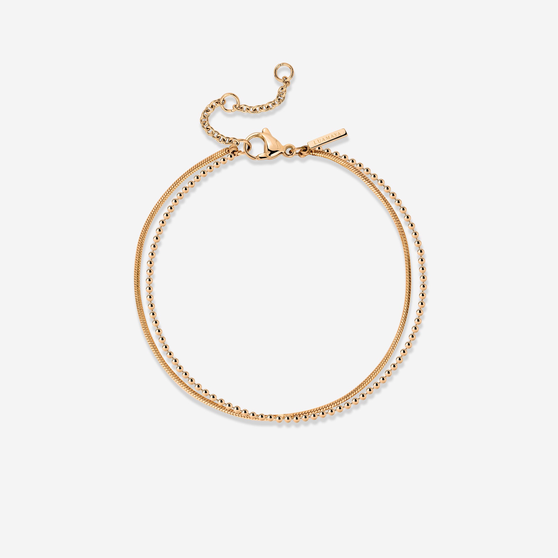 Elegant und verspielt passt zusammen wie du und unser “Duo Beads” Bracelet– ein perfect Match! Das Besondere an diesem Armband sind die zwei unterschiedlichen Chains, die gelayert zu einem einzigartigen Schmuckstück werden. Während die basic Snake Chain einen Touch an Eleganz und Zeitlosigkeit einbringt, ist die Bead Chain viel verspielter und niedlicher. Probier es direkt aus und trage dieses Piece allein oder in Kombination mit unserer passenden “Duo Beads” Necklace!