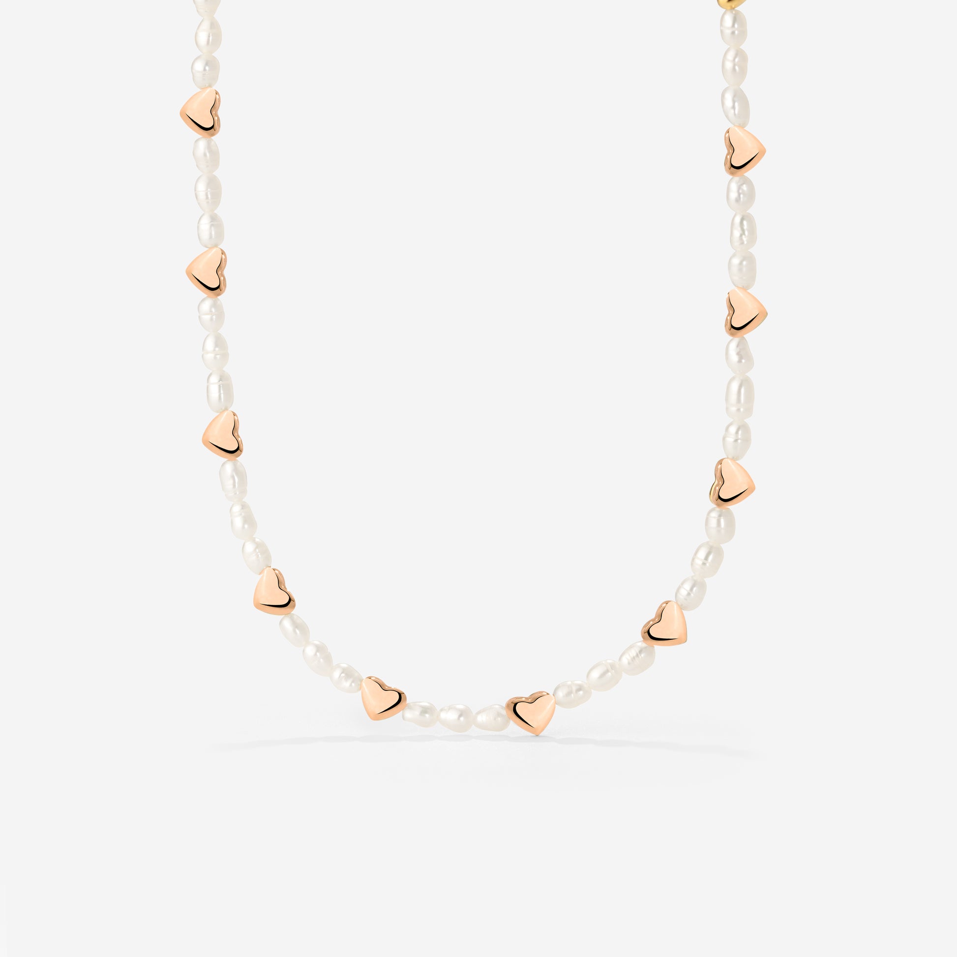 Süßwasserperlen gehören das ganze Jahr über zur Schmuckrotation und werden durch ihre zeitlose Eleganz immer wieder in neuen Trends und Designs eingesetzt. Bei unserer “Love Pearls” Necklace bekommst du einzigartige Perlen in Dreiergruppierungen abwechselnd zu süßen, kleinen Herzchen, die die Halskette verspielt und niedlich wirken lassen. Wenn du also nach einer moderneren, lockereren Variante der klassischen Perlenkette suchst, wirst du mit diesem Schmuckstück garantiert fündig und kannst frischen Wind in deine Sammlung bringen!