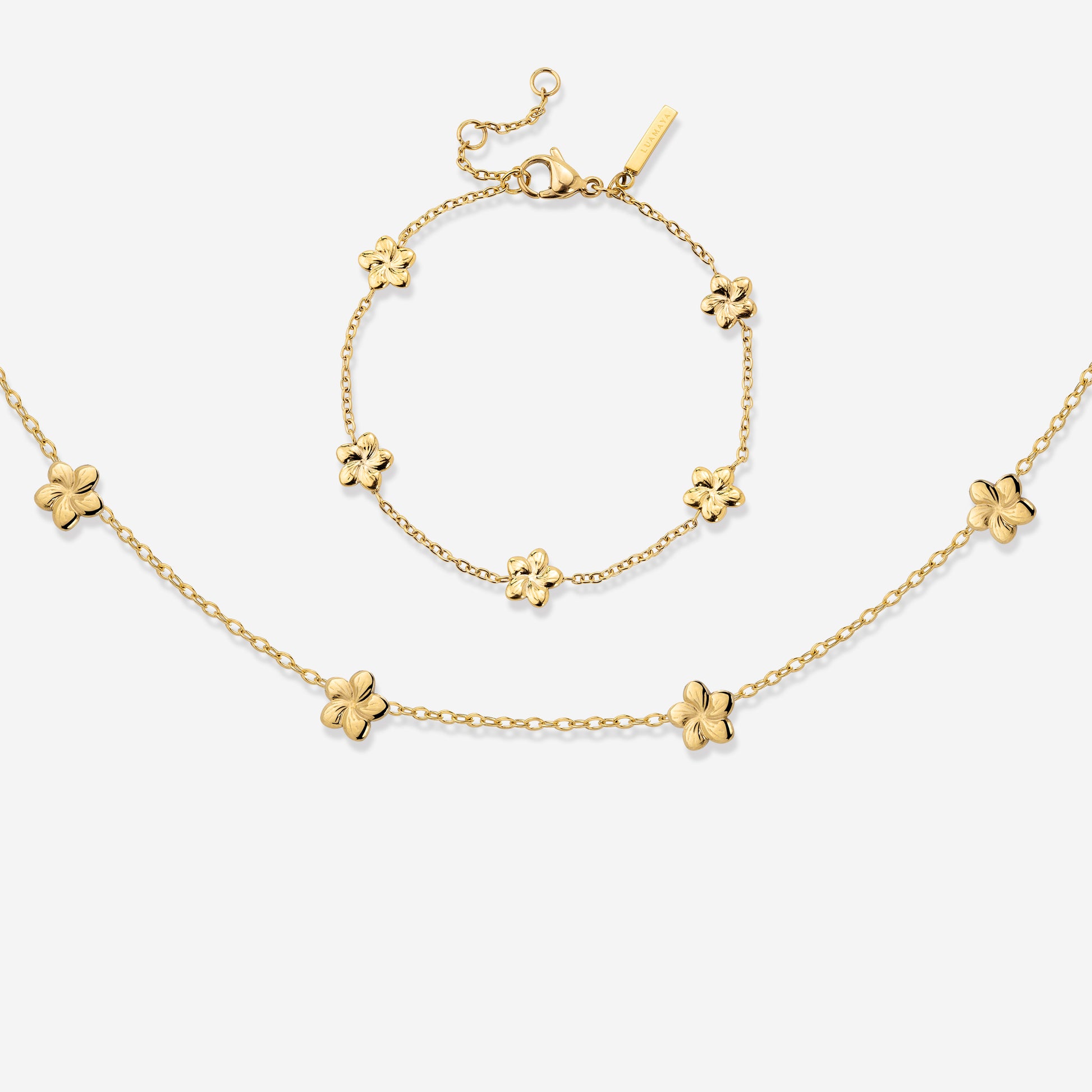Wenn du an Frühling, Sommer, und sonniges Wetter denkst, kommt dir bestimmt eine Blumenwiese in den Kopf, mit verstreuten Blumen in grünen Gräsern, während im Hintergrund die Vögel zwitschern. Wenn wir uns unser “Meadow” Bundle angucken, erinnern uns der gleichnamige Choker und das Armband an genau dieses Bild! Fünf kleine, niedliche Blümchen-Anhänger verzieren die filigranen Chains und bringen dir garantiert positive Vibes in deinen Alltag.