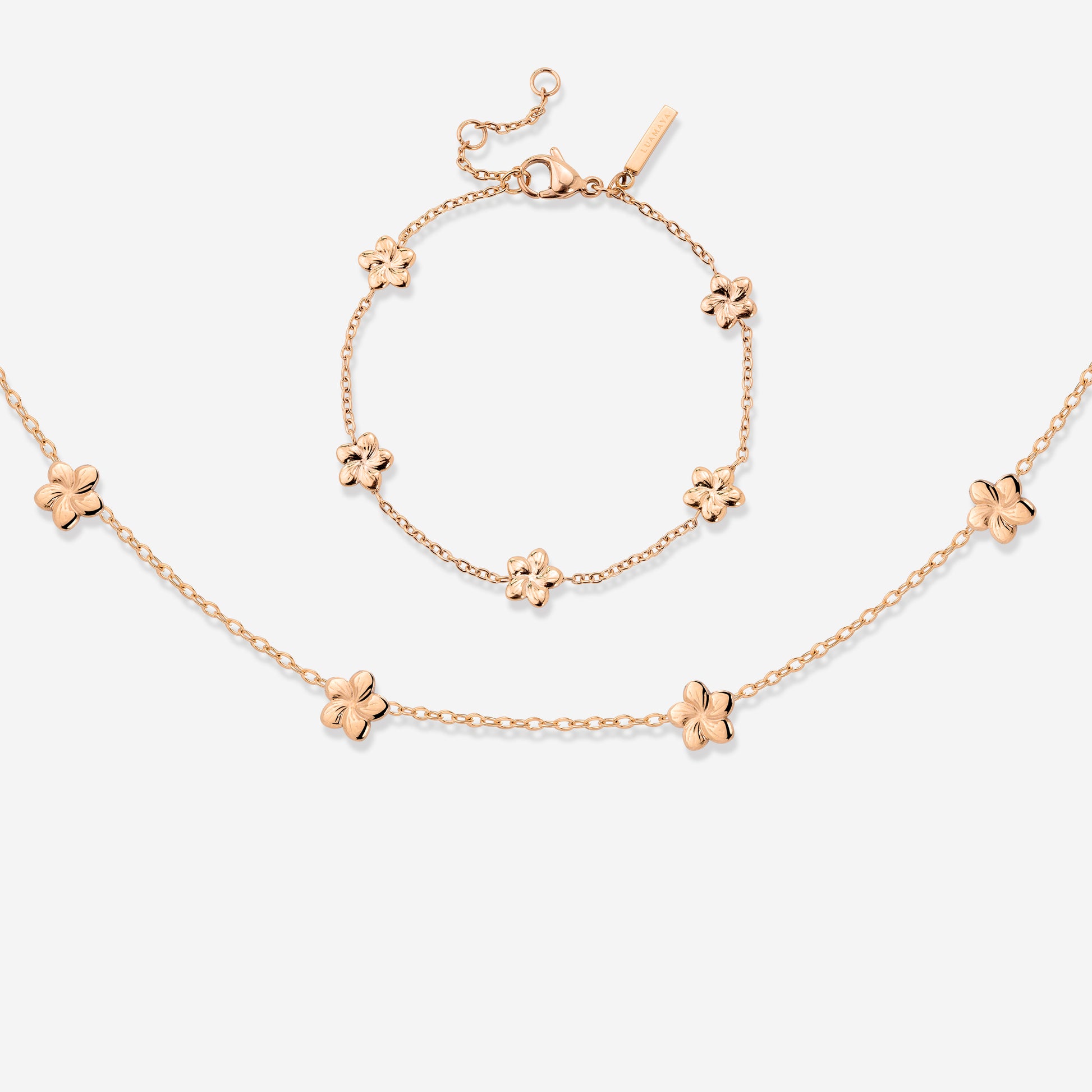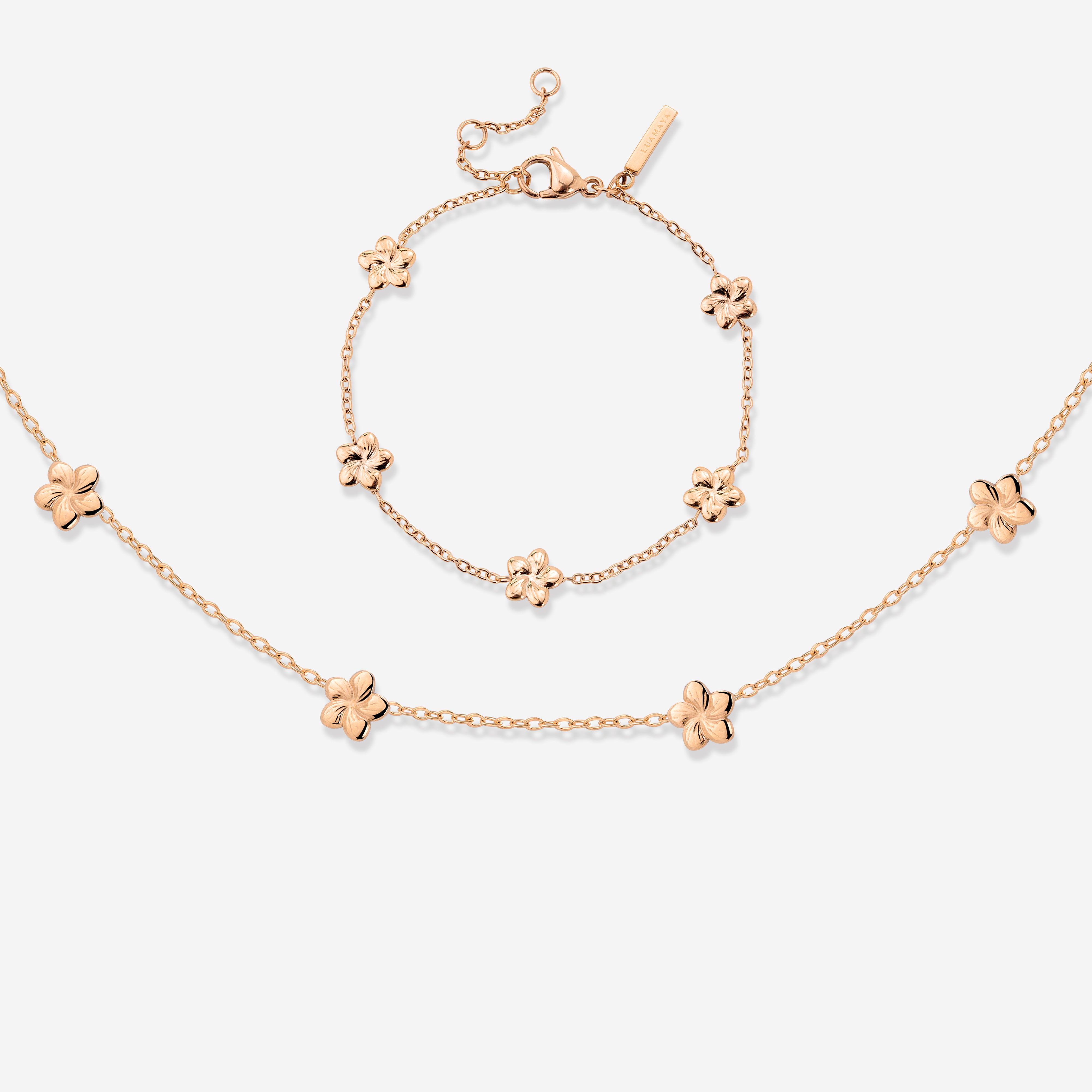 Wenn du an Frühling, Sommer, und sonniges Wetter denkst, kommt dir bestimmt eine Blumenwiese in den Kopf, mit verstreuten Blumen in grünen Gräsern, während im Hintergrund die Vögel zwitschern. Wenn wir uns unser “Meadow” Bundle angucken, erinnern uns der gleichnamige Choker und das Armband an genau dieses Bild! Fünf kleine, niedliche Blümchen-Anhänger verzieren die filigranen Chains und bringen dir garantiert positive Vibes in deinen Alltag.