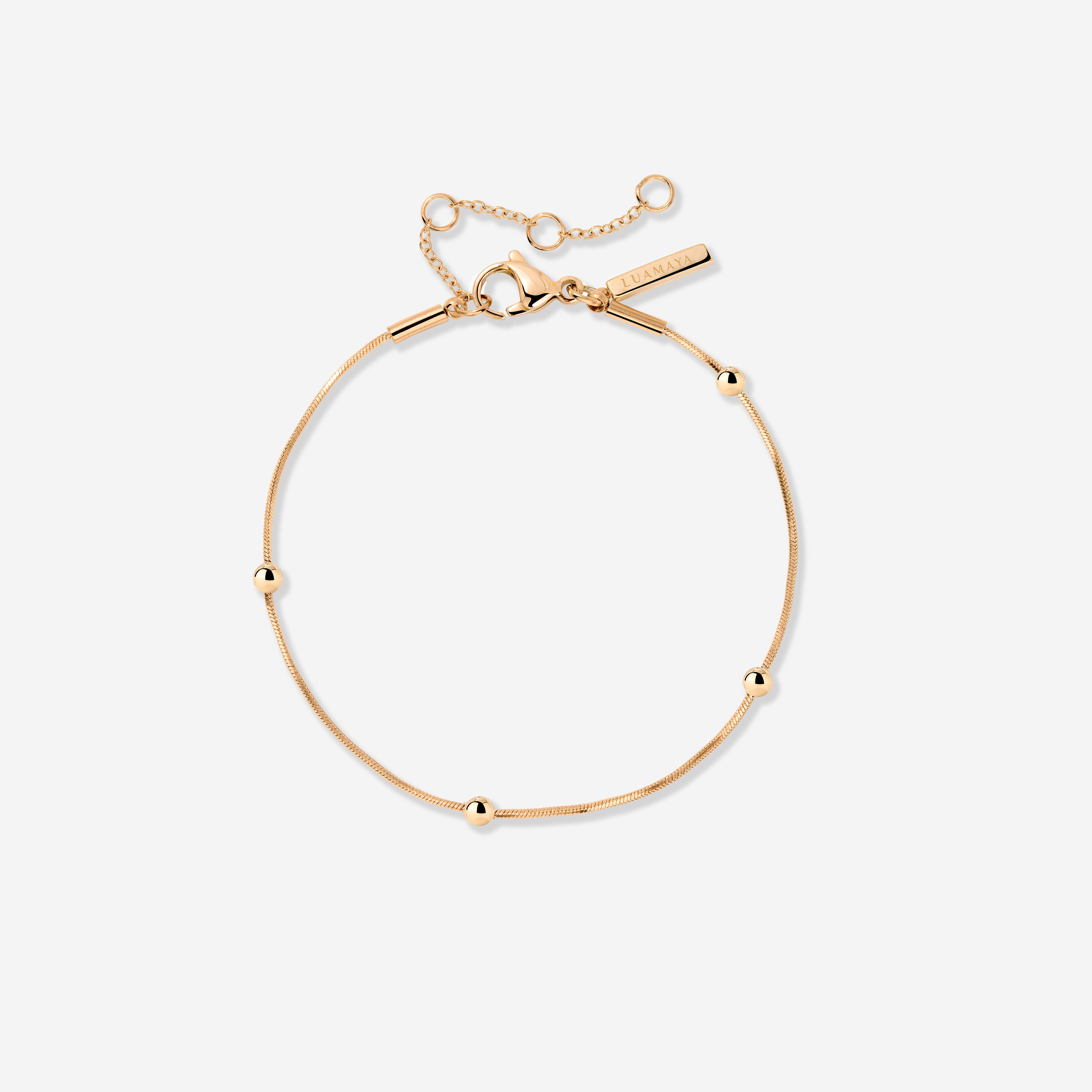 Minimalistische Armbänder sind all time favorites, weil sie zu jedem Stil, jedem Outfit, und jedem Anlass passen. Unser “Moony” Bracelet ist dabei keine Ausnahme und wird bestimmt schnell zu einem deiner Lieblingsschmuckstücke, welches zu am liebsten nie abnehmen würdest. Die schmale Snake Chain wird durch kleine Beads in regelmäßigen Abständen zu einem dezenten Eye Catcher, der dennoch nicht vom eigentlichen Look ablenkt. Durch sein filigranes Design kannst du dieses Armband perfekt als Basis zum layern benutzen oder es auch allein tragen, wenn du zum “Weniger ist mehr”-Club gehörst!