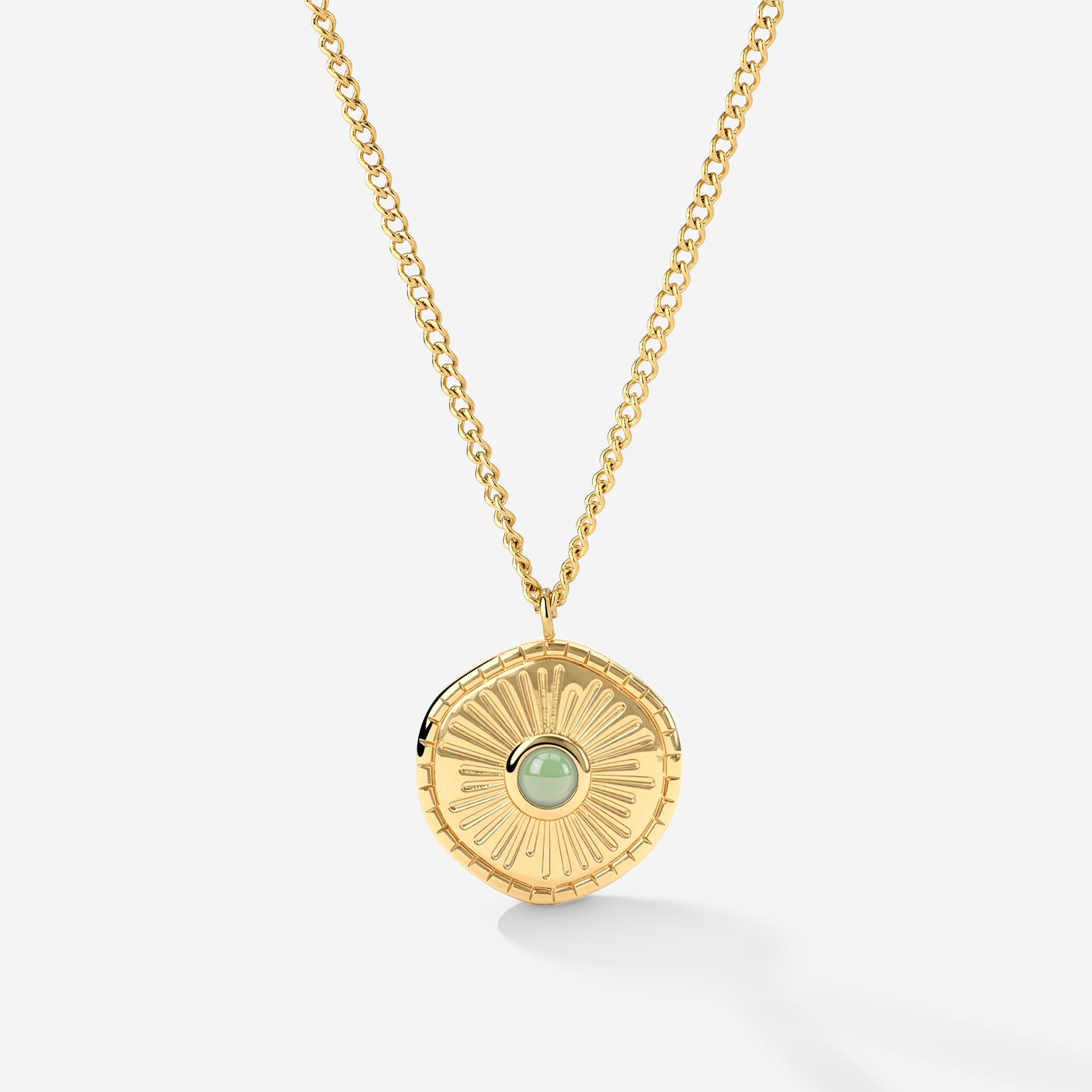 Quarz wird oft als Stein der Reinheit und des Schutzes bezeichnet und findet sich in vielen verschiedenen Formen und Farben in der Natur wieder. Grüner Quarz soll dabei vor allem für Harmonie sorgen und auch emotionale Blocken lösen. In unserer “Moss” Necklace bildet der kleine grüne Naturstein aus Quarz den Fokuspunkt des Schmuckstücks. Eingefasst in einem organisch runden Coin-Anhänger ist er dezent, aber präsent und wird durch die feinen eingravierten Linien zum Strahlen gebracht. Lass diese Halskette dein kleiner Glücksbringer sein und dich stets an Gleichgewicht und positive Energien erinnern - don't miss out on it!