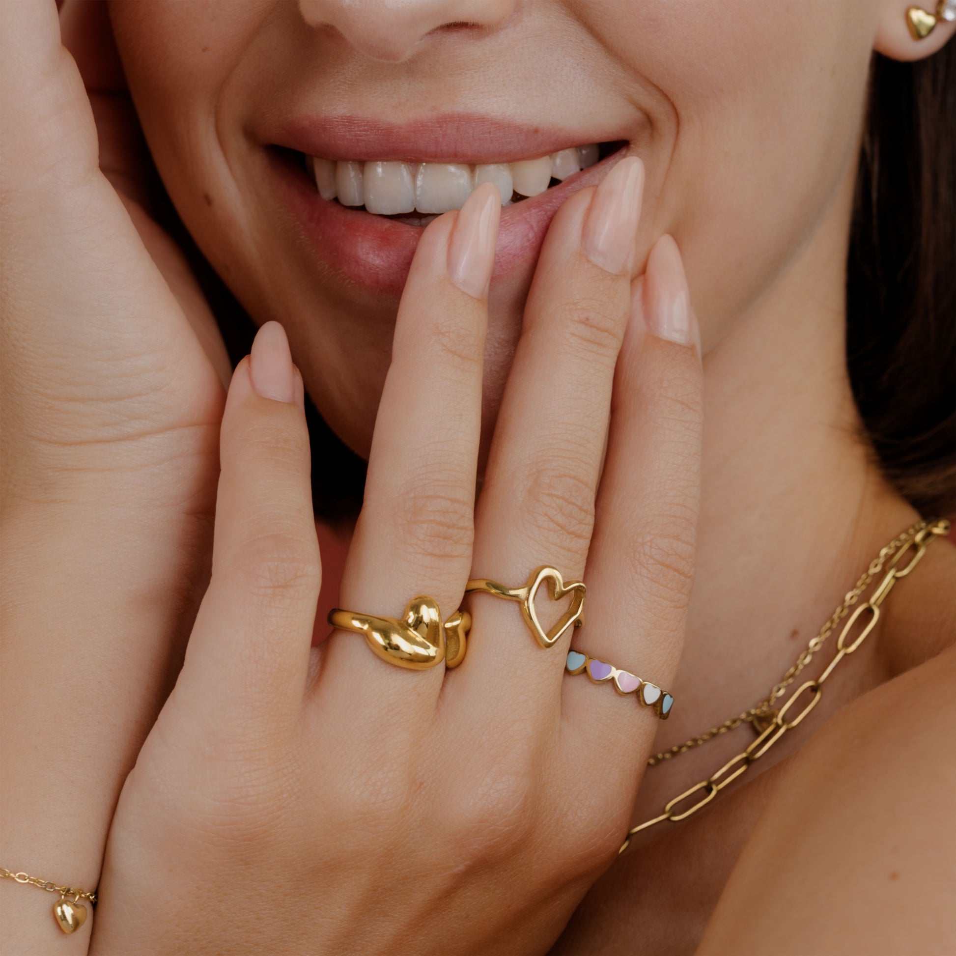 Vor allem wenn es draußen wieder kälter und dunkler wird, brauchen wir ein wenig mehr Farbe in unserem Leben und unser “Pastel Hearts” Ring ist der perfekte Mood Booster! Der schmale Ring wird mit kleinen Herzchen in Pastelltönen verziert und wird dir beim Tragen garantiert immer ein Lächeln ins Gesicht zaubern. Zeig dir selbst ein bisschen Liebe und bleib bunt und happy!