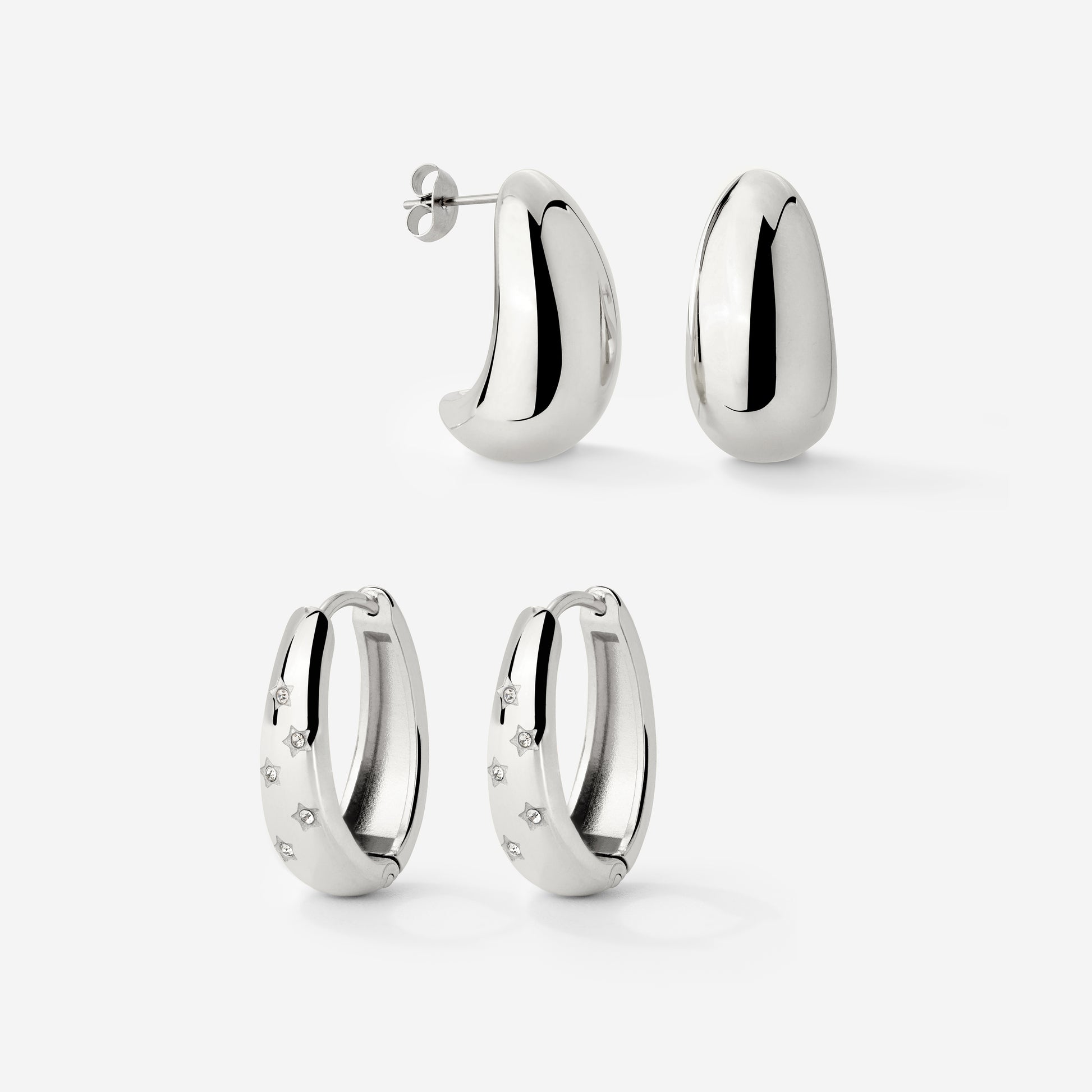 Du setzt gerne Statements und lässt deinen Schmuck für sich sprechen? Dann ist unser “Starstruck” Bundle genau das Richtige für dich! Die Kombination aus unseren mit Zirkoniasteinen besetzten “Starstruck” Hoops und unseren cleanen “Huggie” Studs ist perfekt für einen ausdrucksstarken Look, der alle Blicke auf sich zieht. Und wenn du doch mal Lust auf einen minimalistischeren Tag hast, kannst du die Ohrringe natürlich auch einzeln tragen oder mit dezenteren Studs oder Hoops kombinieren.