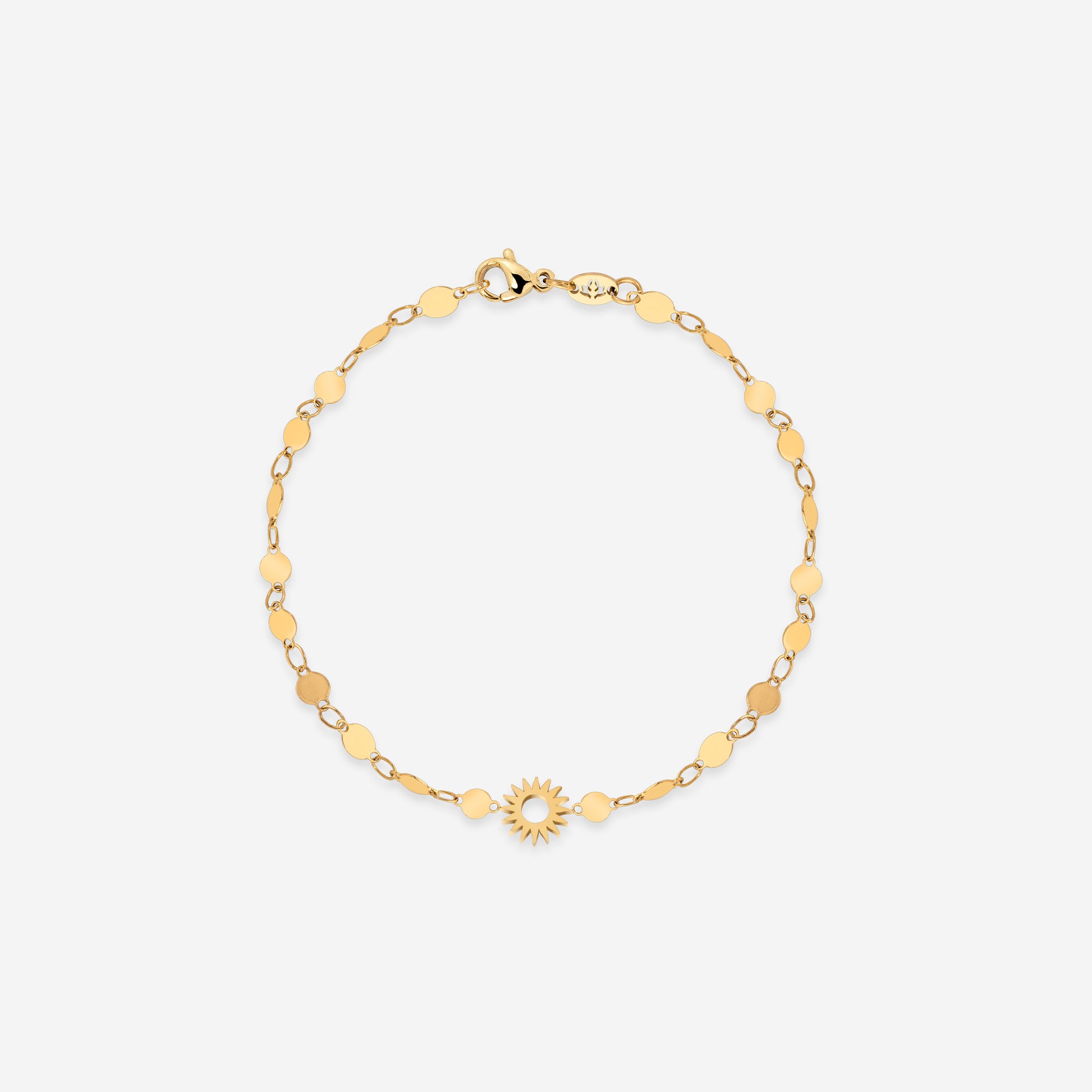 Mit unserem “Sunny Side Up” Bracelet ist die Sonne ganz bestimmt immer auf deiner Seite und macht dich zum strahlenden Hingucker für jeden Anlass, ob am Strand oder auf der heißesten Sommerparty des Jahres. Das bereits beliebte, aus feinen Plättchen bestehende Armband, kombinieren wir in dieser Variation mit einem edlen Sonnenanhänger und kreieren damit das ultimative favourite für euch!