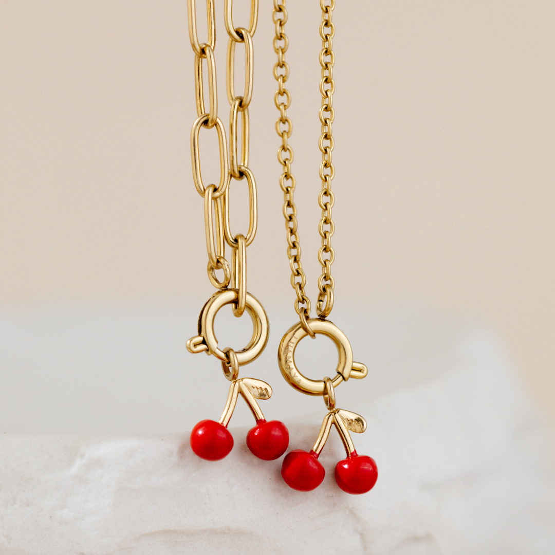 Der fruchtige Sommertrend des Jahres geht weiter mit unserem “Very Cherry” Oval Links Necklace Set! Der zuckersüße Kirsch-Charm passt perfekt zu der trendigen Halskette mit länglichen, ovalen Gliedern und wird schneller zu deinem neuen Lieblingspiece, als du “Cherri Cherri Lady” sagen kannst. Wenn du noch den extra fruity Kick brauchst, kombiniere diese Halskette doch mit unserem beliebten “Very Cherry” Hoop Set Baby für den perfect Match!