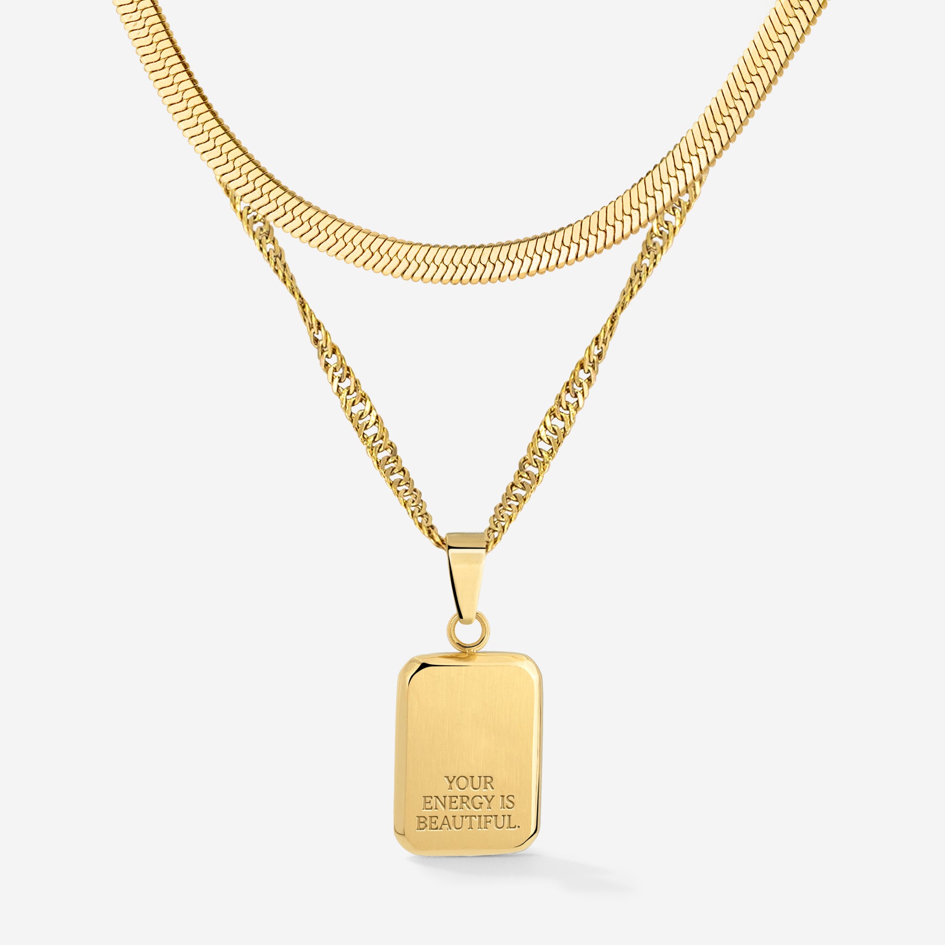 Unser “Your energy is beautiful” Bundle ist dein täglicher reminder, dass deine Ausstrahlung das Schönste an dir ist, was es gibt. Die leicht gedrehte, feine Singapore Chain passt perfekt zum rechteckigen Anhänger mit Gravur und unterstreicht jedes deiner Outfits. In Kombination mit unserer schlichten “Slim Herringbone Necklace ist dieses Set ideal für jeden Tag und jeden Anlass. Die gravierte Botschaft ist dabei der letzte Schliff für ein Schmuckstück, welches dich jeden Tag begleiten wird. Beschenk dich selbst oder zeige deinen liebsten Menschen, wie sehr du ihre Präsenz und Energie liebst und denk immer daran: was du nach außen trägst, umgibt dich wie eine Aura.