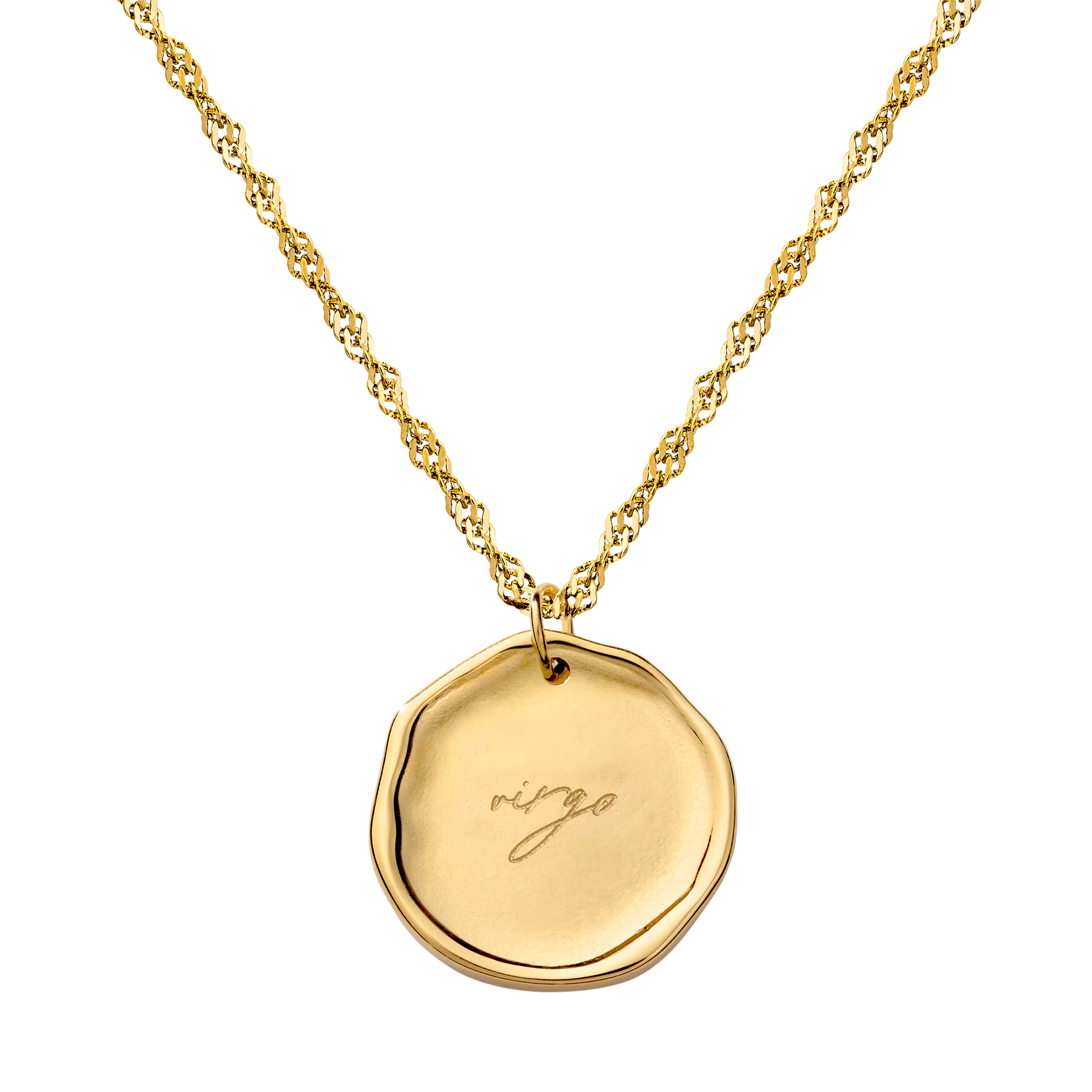 Unsere “Zodiac” Necklace ist das perfekte Geschenk für jedes Astrology Girly, egal ob zum Geburtstag, zu Weihnachten, oder zum Valentinstag. Der sleeke, minimalistische Anhänger kann von beiden Seiten getragen werden und ist von vorne mit dem Sternzeichen Symbol und von hinten mit einem Schriftzug graviert. In Kombination mit unserer zarten und filigranen Singapore Chain hast du damit das ultimative Piece für jeden Tag und jeden Anlass, ob im Layerlook oder allein getragen. Mach dir selbst oder einem deiner Liebsten eine persönliche und magische Freude und lass dir diese Halskette auf keinen Fall entgehen!